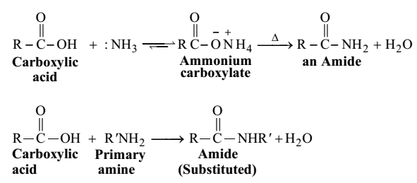 Carboxylic acids react with ammonia or amines to give amides. The reaction involves the formation of an ammonium carboxylate salt as an intermediate which on heating gives amide.