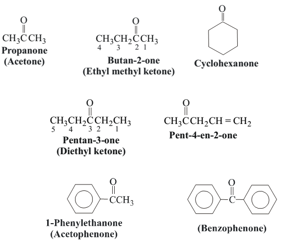 Ketones are named as alkanones in the IUPAC namenclature. Their names are obtained by replacing final -e in the name of alkane by -one. The carbon chain is numbered in such a way that the carbonyl group gets the lowest number.