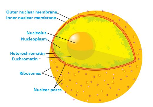 The Nucleus is a double-membrane bound cell organelle present in eukaryotic cells. It contains the DNA, the genetic material. It is the command center of the cell and is spherical in shape. It has the following components:
