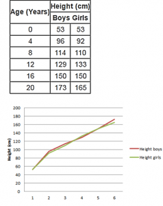 The above graph shows the relation between the age and height of both boys and girls. At the time of puberty there is a sudden increase in height of both boys and girls. On the basis of the above graph, it can be observed that during the age of 4-8 years, girls have less height as compared to boys. However, as soon as girl reach 12-13 years, their height shows a sudden increase and become more than boys. In later years, growth in both sexes becomes stable. Growth during puberty is under the control of hormones.