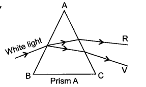 Answer. Consider a prism A. When white light falls on it, it splits into seven constituent colours. The violet colour deviates the most and red colour deviates the least, as shown.