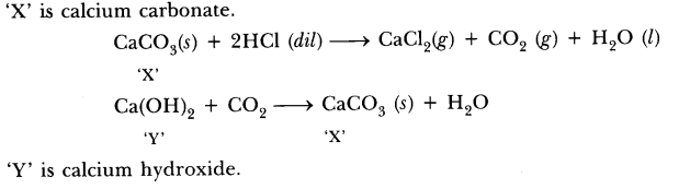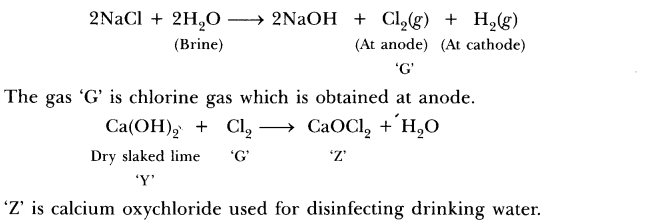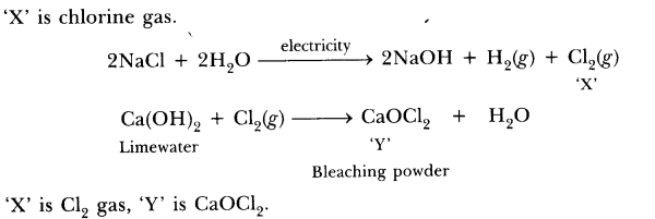 8.In one of the industrial processes used for manufacture of sodium hydroxide, a gas X is formed as by-product. The gas X reacts with lime water to give a compound Y which is used as a bleaching agent in chemical industry. Identify X and Y giving the chemical equation of the reactions involved.