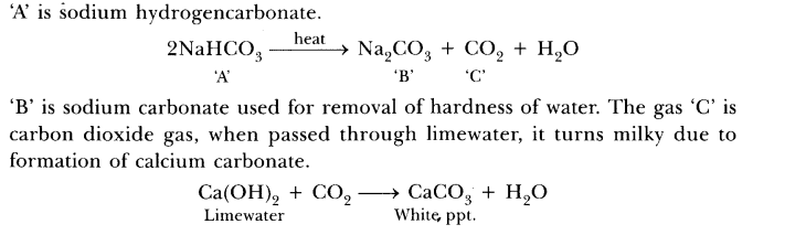 7.Salt A commonly used in bakery products on heating gets converted into another salt B which itself is used for removal of hardness of water and a gas C is evolved. The gas C when passed through lime water, turns it milky. Identify A, B and C.