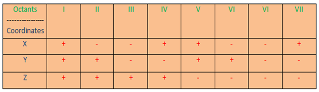\(\Rightarrow\) The x – coordinates, y – coordinates and z – coordinates of point (7, -1, -4) are positive, negative and negative. Therefore, this point is lying in octant (VII).