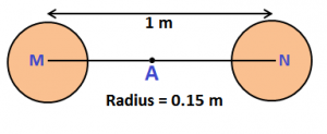 From the above figure, ‘A’ is the mid-point and since each sphere will exert the gravitational force in opposite direction. Therefore, the gravitational force at this point will be zero.