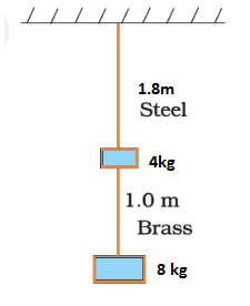 Q5. A wire made up of steel and brass and having a diameter of 0.30 cm is loaded as depicted in the diagram below. The unloaded length of the brass wire is 1 m and that of the steel wire is 1.8.Find the length of elongations in the brass and steel wires.