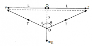 Let YZ be the mild steel wire of length 2l = 2m and cross sectional area A = 0.60 x 10 -2 cm2 . Let the mass of m = 100 g = 0.1 kg be hung from the midpoint O, as shown in the figure. And let x be the depression at the midpoint i.e OD