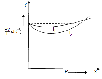 (ii) The dotted line in the plot stands for an ideal gas. At temperature T1 the curve of the gas is closer to the dotted plot than at temperature T2 . A real gas behaves more like an ideal gas when its temperature rises. Thus, T1 > T2 is true for the given graph.