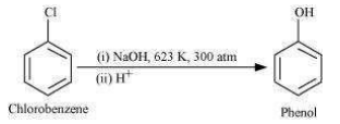 (iii) Chlorobenzene does not undergo hydrolysis under normal conditions. However, it undergoes hydrolysis when heated in an aqueous sodium hydroxide solution at a temperature of 623 K and a pressure of 300 atm to form phenol.