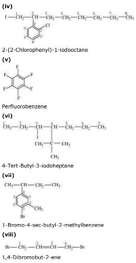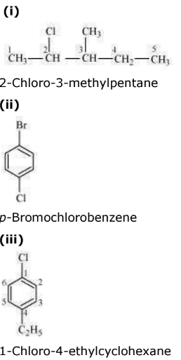 \(\left ( i \right ) \left ( CH _{ 3 } \right )_{ 2 }CH CH \left ( Cl \right )CH _{ 3 } \\ \left ( ii \right )CH _{ 3 } CH _{ 2 } CH \left ( CH _{ 3 } \right )CH \left ( C _{ 2 } H _{ 5 }\right ) Cl \\ \left ( iii \right )CH _{ 3 } CH _{ 2 } C \left ( CH _{ 3 } \right )_{ 2 } CH _{ 2 } I\)