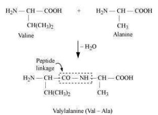 A peptide linkages is the amide which is formed by the elimination of a water molecule between the –COOH group of one molecules of an amino acid and \(-NH _{2}\) group of another molecule of the amino acid.