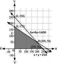The corner points are A (250, 0), B (200, 50), and C (0, 175).