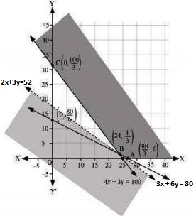 As the feasible region is unbounded, therefore, 104 may or may not be the minimum value of Z. For this, we draw a graph of the inequality, 4x + 6y < 104 or 2x + 3y < 52, and check whether the resulting half plane has points in common with the feasible region or not. It can be seen that the feasible region has no common point with 2x + 3y < 52