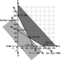 The corner points are \(A\left ( \frac{700}{3},0 \right )\), B (100, 80), and C (0, 280).