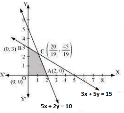 The corner points of the feasible region are O (0, 0), A (2, 0), B (0, 3), and C ( 20/19 , 45/19 ).