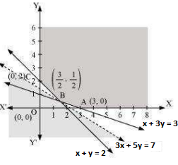 Hence, we plot the graph of the inequality, 3x + 5y < 7, and see whether the resulting half plane has points in common with the feasible region or not. It can be observed that the feasible region has no common point with 3x + 5y < 7. Therefore, the minimum value of Z is 7 at ( 3/2 , 1/2 )