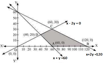 The feasible region determined by the constraints, x + 2y ≤ 120, x + y ≥ 60, x − 2y ≥ 0, x ≥ 0, and y ≥ 0, is as follows :