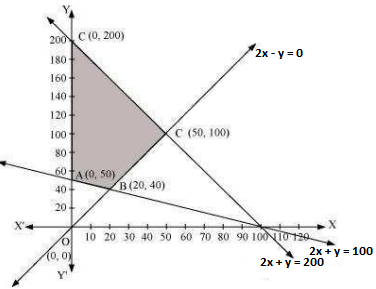 The feasible region determined by the constraints, x + 2y ≥ 100, 2x − y ≤ 0, 2x + y ≤ 200, x ≥ 0, and y ≥ 0, is as follows: