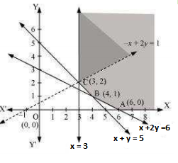 The feasible region determined by the constraints, x ≥ 3, x + y ≥ 5, x + 2y ≥ 6, y ≥ 0 is as follows :