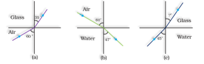 Refraction of a ray which is incident at \(60°\)with the normal to a glass-air and water-air interface is shown in the above figures (a) and (b). What will be the angle of refraction in glass when the angle of incidence in \(45°\) with the normal to a water-glass interface(c)