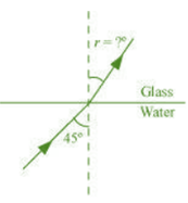 \(\frac{sin\;i}{sin\;r}=\mu_{g}^{w}\\ \frac{sin45°}{sin\;r}=1.275\\ sin\;r=\frac{\frac{1}{\sqrt{2}}}{1.275}=0.5546\\ Therefore\;r=sin^{-1}(0.5546)=38.68°\)
