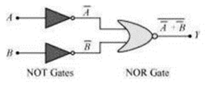 (b) A and B are the inputs and Y is the output of the given circuit. By using the result obtained in solution (a), we can infer that the outputs of the first two NOR gates are\(\bar{A} \; and \; \bar{B}\), as shown in the figure.
