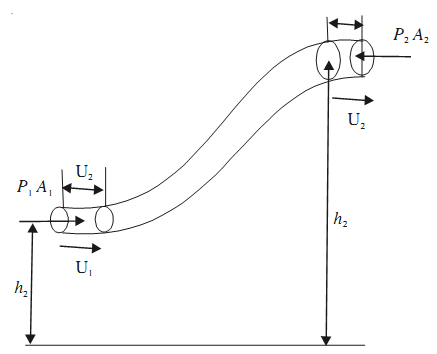 Consider a tube of varying cross section. Suppose at point A the pressure is P1, area of cross section A1, velocity of flow v1, height above the ground h1 and at B, the pressure is P2, area of cross-section A2, velocity of flow = v2, and height above the ground h2.