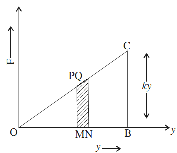 You get a straight line graph. Take two points P and Q and drop perpendiculars PM and QN on x–axis. As points P and Q are close to each other, trapezium PQNM can be regarded as a rectangle. The area of this rectangular strip is (ky ∆y). This area equals the work done against the restoring force ky when the displacement changes by a small amount ∆y.