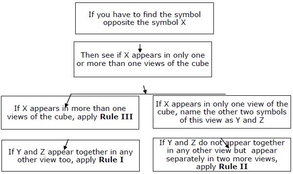 Rule I − Let us call that figure X, the opposite of which you have to find. Suppose in any one view of the cube, X appears with Y and Z. Along with a third figure (say A), then X will be opposite A.